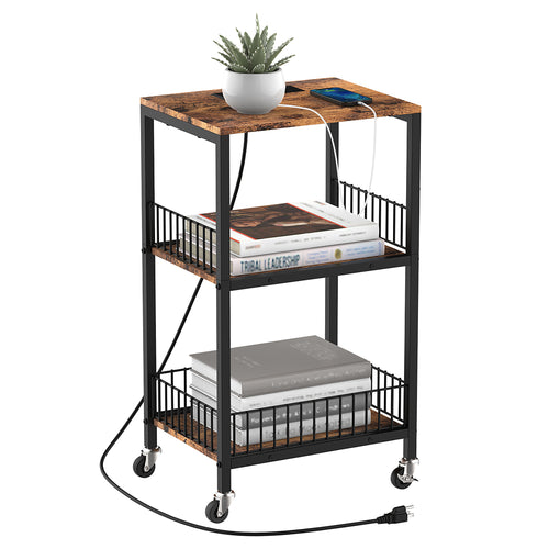 NOMISPADVIC End Table with Charging Station, 3-Tier Rolling Nightstand with USB Ports & Electrical Outlets, Mobile Bedside Table with Storage Shelves for Bedroom, Living Room, Office